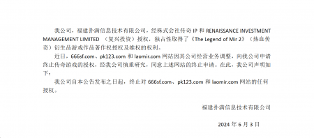 福建撲滿信息技術有限公司注冊地位于福建省福州市,是國內(nèi)《熱血傳奇》客戶端游戲獨占性版權人。對《熱血傳奇》客戶端游戲擁有全部版權,并有權基于版權權利進行該游戲維權。株式會社傳奇IP (以下簡稱傳奇IP )對《The Legend of Mir 2》(中文名為“熱血傳奇"、或“傳奇”、“傳奇2”、“MIR II”)游戲(以下稱為 “授權作品”) 共同享有充分、完整且有效的著作權。經(jīng)傳奇IP授權 , RENAISSANCE INVESTMENT MANAGEMENT LIMITED (以下簡稱 RENAISSANCE Ltd.)有權在中國大陸地區(qū)獨占性地對授權作品的網(wǎng)絡客戶端游戲進行開發(fā)、 發(fā)行、管理、宣傳、推廣和運營,針對授權作品的侵權游戲及侵權方,RENAISSANCE Ltd.有權采取必要的措施,并有權將前述權利分授權給第三人。福建撲滿信息技術有限公司經(jīng)RENAISSANCE Ltd.授權,獲得上述權利,有權在中國大陸地區(qū)獨占性地對授權作品的網(wǎng)絡客戶端游戲進行開發(fā)、發(fā)行、管理、宣傳、推廣和運營,并有權對侵權行為/主體采取維權措施。